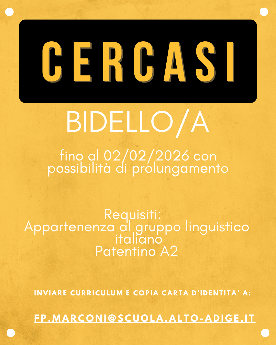 Inviare il proprio curriculum aggiornato e copia della carta d'identità a fp.marconi@scuola.alto-adige.it
